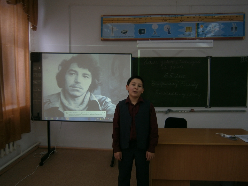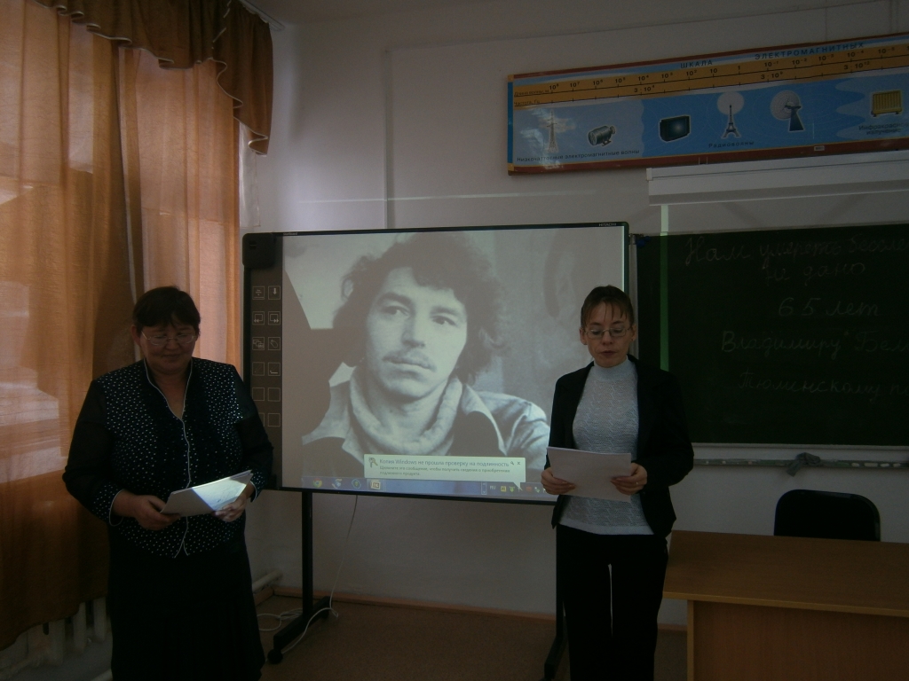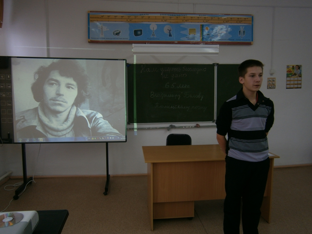 В рамках мероприятий, посвященных году Культуры, в школе прошел библиотечный урок «Нам умереть бесследно не дано», посвященный 65-летию тюменского поэта Владимира Белова. На уроке прозвучали стихи поэта в исполнении учащихся. Ребята с большим интересом послушали рассказ о жизни и творчестве Владимира Белова.
