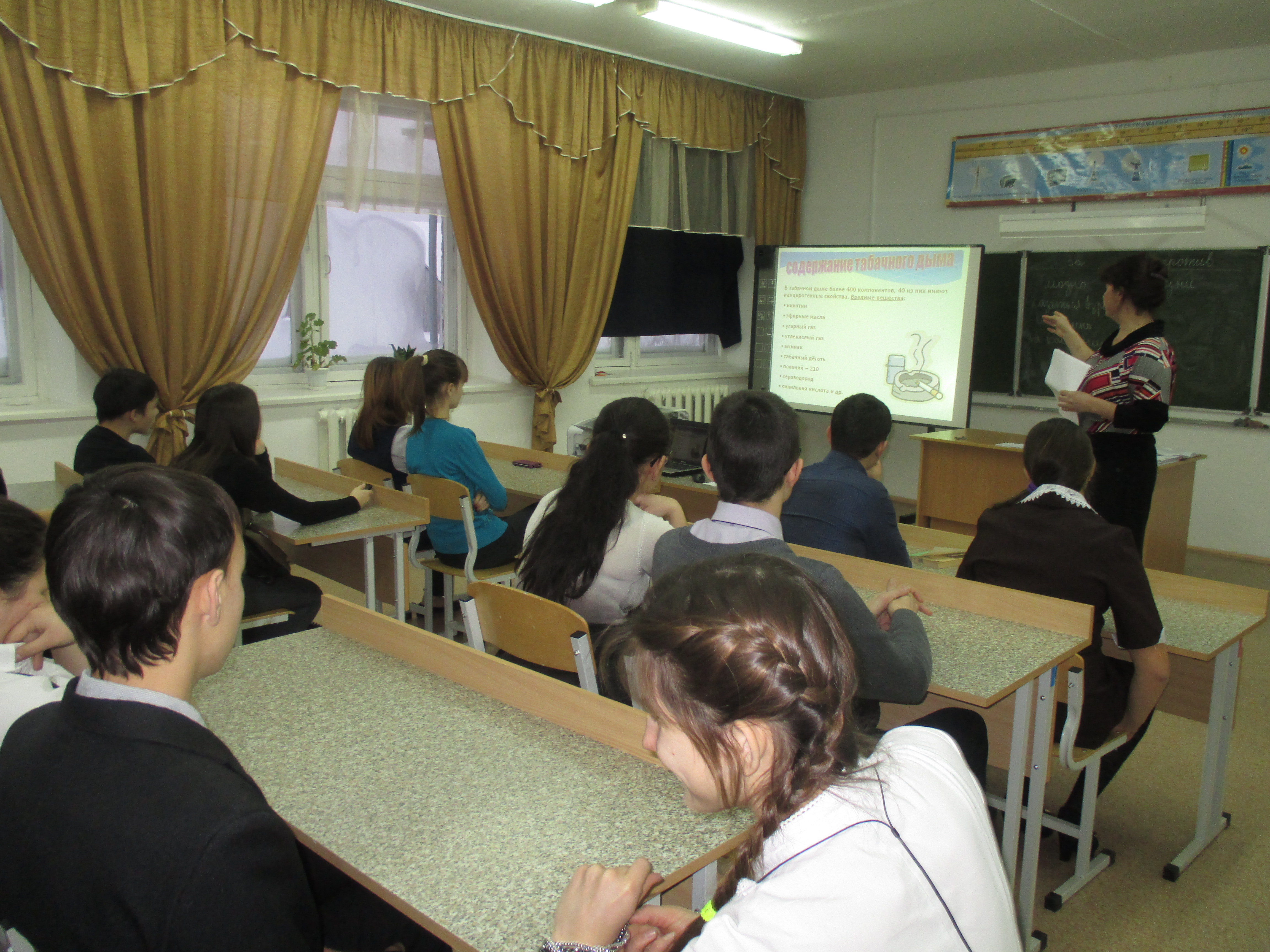 Заведующая кабинетом ПАВ Назырова Г.Р провела для учащихся школы профилактическое мероприятие «Курение или фактор риска». Она рассказала о вреде курения, о последствиях этой пагубной привычки. Ребята смотрели презентацию, анализировали и делали самостоятельные выводы о том, к каким последствиям может привести курение.
