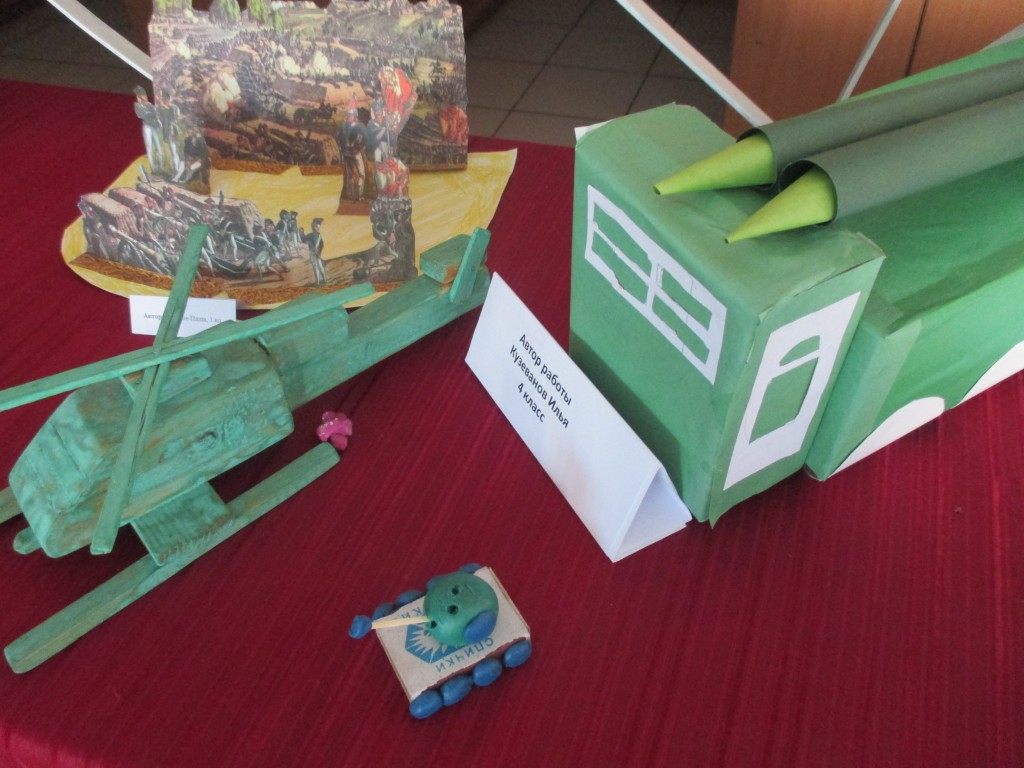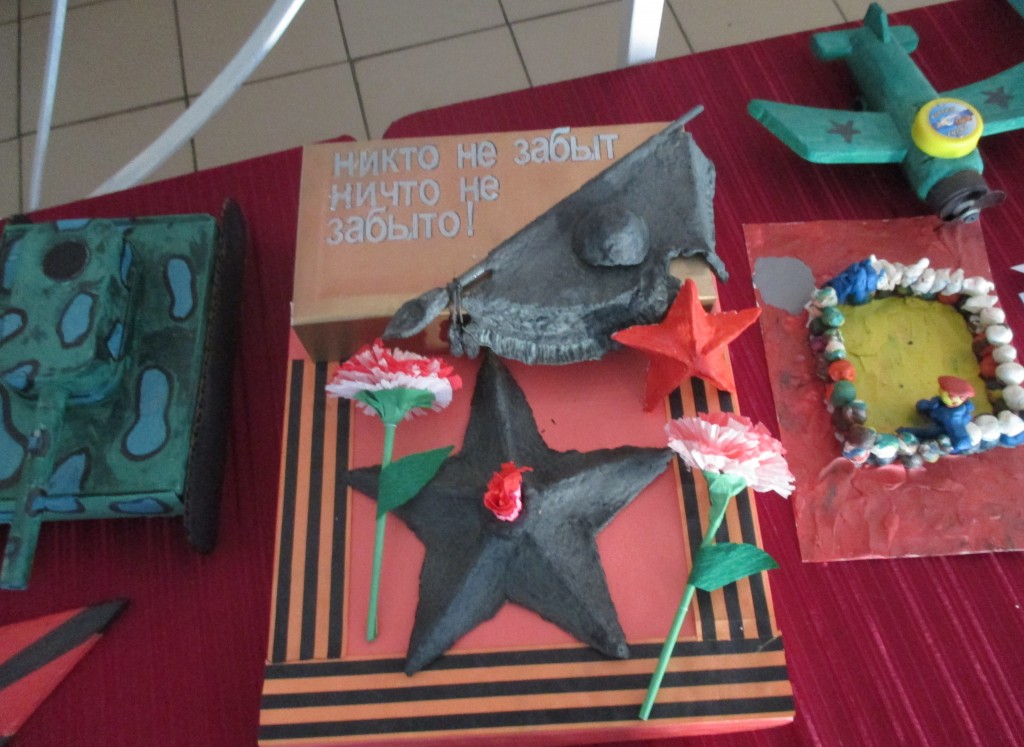 В школе прошла выставка творческих работ обучающихся приуроченная к празднованию Дня Победы. Конкурс декоративно – прикладного творчества был организован с целью повышения уровня интереса детей к изучению истории Великой Отечественной войны, значения Победы в истории России.