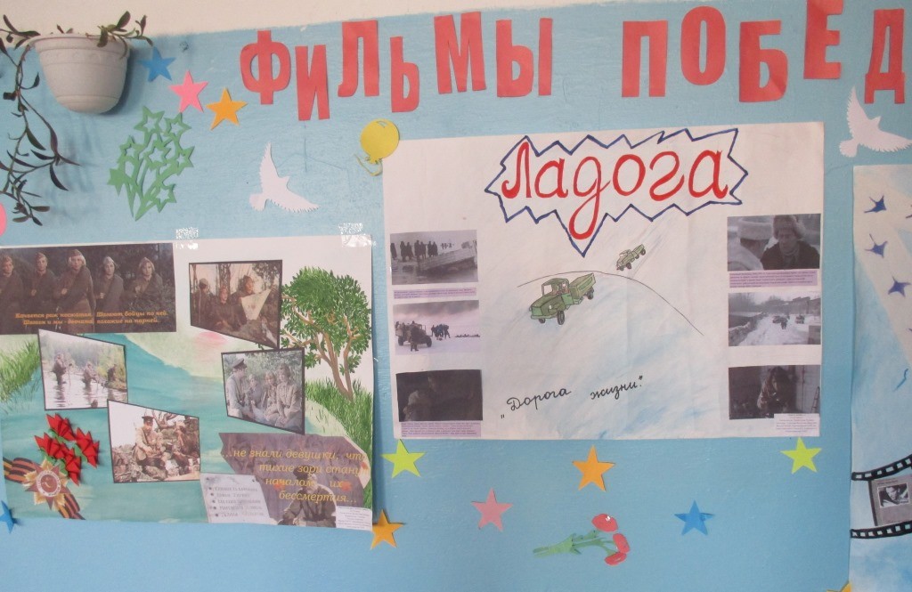 В рамках акции «Фильмы победы» школьники в течении месяца просматривали и обсуждали фильмы, посвященные Великой Отечественной войне 1941-1945г. Затем состоялся конкурс газет, посвященный самому понравившемуся фильму о ВОВ.