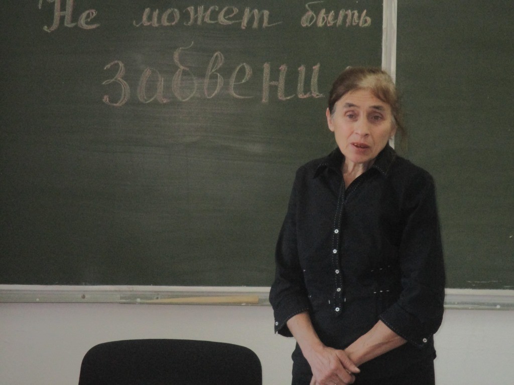 Чурак В.А. рассказала о трагической судьбе своего деда Хиврич Е.П., который был раскулачен и расстрелян в 30-е годы, за то, что семья имела большое хозяйство. Также Валентина Александровна рассказала о трагической судьбе семьи своего отца Кох А.Г, которая проживала в 40-е годы в Поволжье и когда началась Великая Отечественная война, была выселена в Сибирь. Она познакомила ребят с теми испытаниями, которые пришлось пережить членам этой семьи и своему отцу – Кох А.Г.