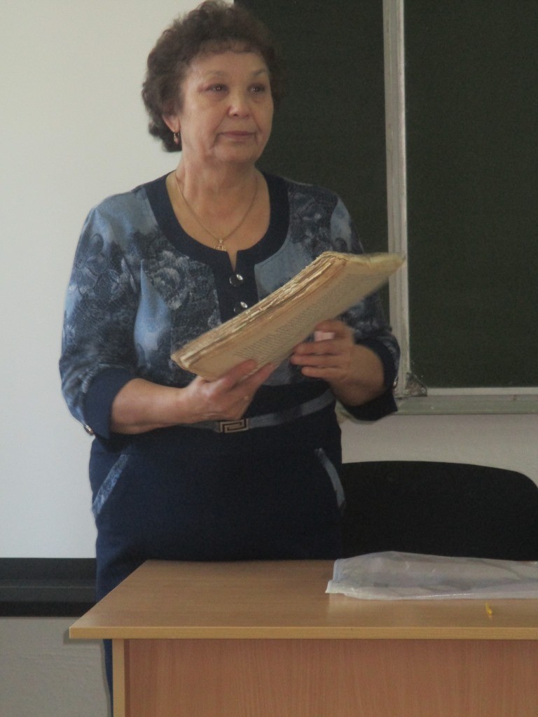 Перед школьниками выступила Садыкова С.М, она рассказала о трагической судьбе своего деда – Хабибулина Айбатуллы. В 30-е годы двадцатого века он был муллой в деревне Балахлей, в сентябре 1937 года он был арестован органами НКВД, а затем расстрелян в пригороде г.Ишима. Зоя Михайловна с трепетом показала одну из религиозных книг, которая осталась в семье после смерти дедушки.