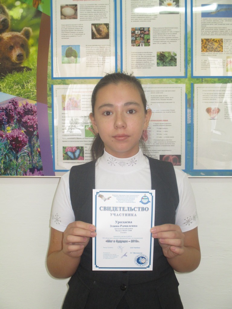 3 ноября ученица 6 класса Урозаева Элина приняла участие в областном научном форуме молодых исследователей «Шаг в будущее-2016». На данном форуме она выступила с исследовательской работой по теме «Микрофлора воздуха школьных помещений» в секции «Экология».