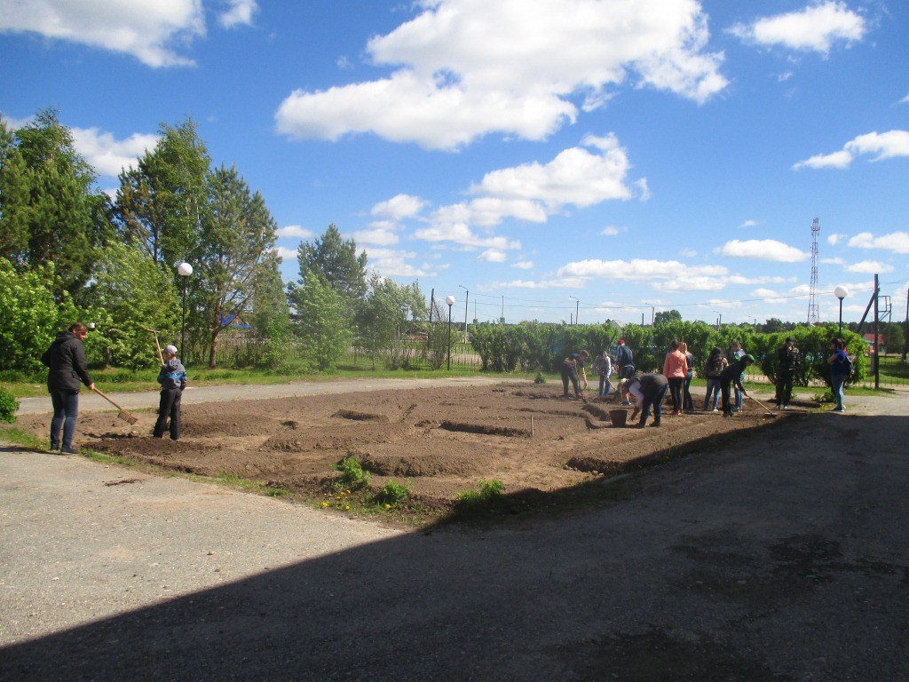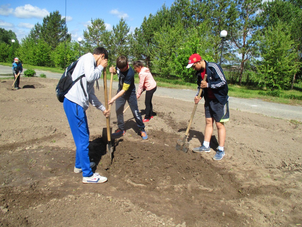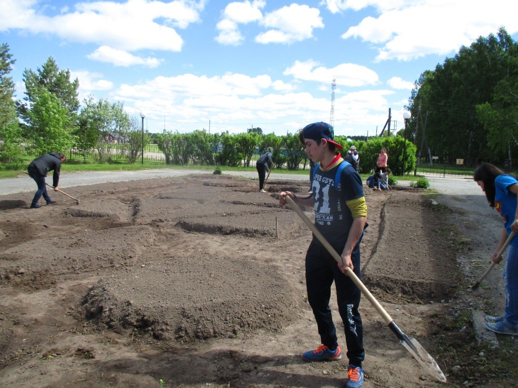 С самого утра во дворе школы кипит работа, вооружившись граблями и лопатами, ребята готовят грядки и клумбы для новых зеленых питомцев, пропалывают сорняки, рыхлят землю.