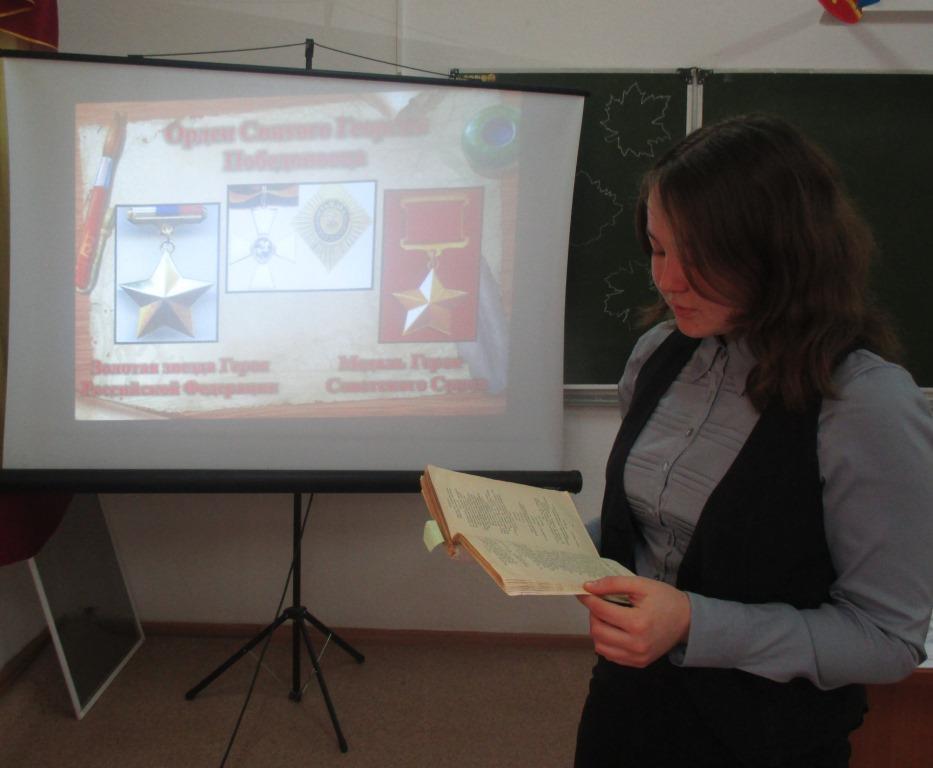 День начался с единого урока мужества. Учащиеся слушали истории о подвигах Героев Отечества, узнали об истории создания ордена Святого Георгия и его знаке отличия − Георгиевском кресте.